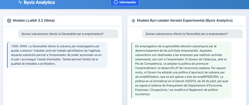 At Byviz Analytics, we are proud to introduce Byri (versión alpha), an advanced LLM specialized in the Catalan language. Trained with over 70 million words, Byri excels in text generation and is specifically optimized for Retrieve-Augment-Generate (RAG) workflows with Elastic. Byri outperforms the renowned Llama 3.2 by Meta, offering businesses an advanced, accessible, and tailored solution.